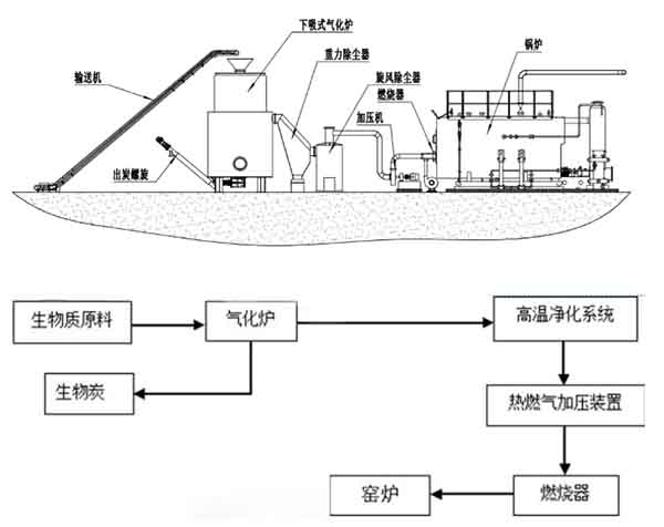 生物質原料通過螺旋加料機加入氣化爐,而氣化所需要的空氣通過鼓風機從氣化爐底部的配風裝置進入氣化爐內,生物質原料在缺氧狀態(tài)下燃燒生成可燃氣體和焦油,部分焦油在高溫下發(fā)生二次裂解為不凝性可燃氣體。熱分解析出的焦碳與燃燒產生的水蒸汽和二氧化碳進行還原反應,產生氫氣、一氧化碳等可燃氣體,在氣體上升過程中,繼續(xù)進行還原和熱解反應。氣態(tài)焦油、氣體連同灰渣顆粒、焦碳從氣化爐上部流出,進入隨后的燃氣凈化分離裝置旋風除塵器,進入旋風除塵器絕大部分灰渣通過旋風除塵器從燃氣中分離出來?;以ㄟ^除灰裝置、灰輸送裝置輸送到合適的地點。旋風除塵器分離出來的燃氣進入燃氣加壓裝置,被壓送到鍋爐燃燒機完全燃燒。